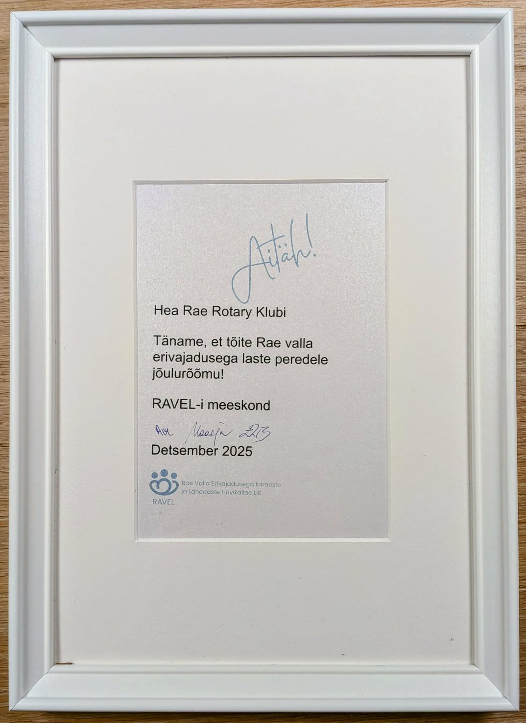 Aasta eelviimasel klubikoosolekul olid Rae Rotary Klubis külalisteks Dali Getter Karat, meie Rotary õde, kes on aktiivne Tallinn Moon Rotary Klubi liige ja Elis Kaurson (Rae Valla Erivajadusega Inimeste ja Lähedaste Huvikaitse Liit RAVEL) kes oli tulnud meid tänama ja tänukirja üle andma. Toetasime Rae valla erivajadustega laste ja nende perede jõuluetendust.