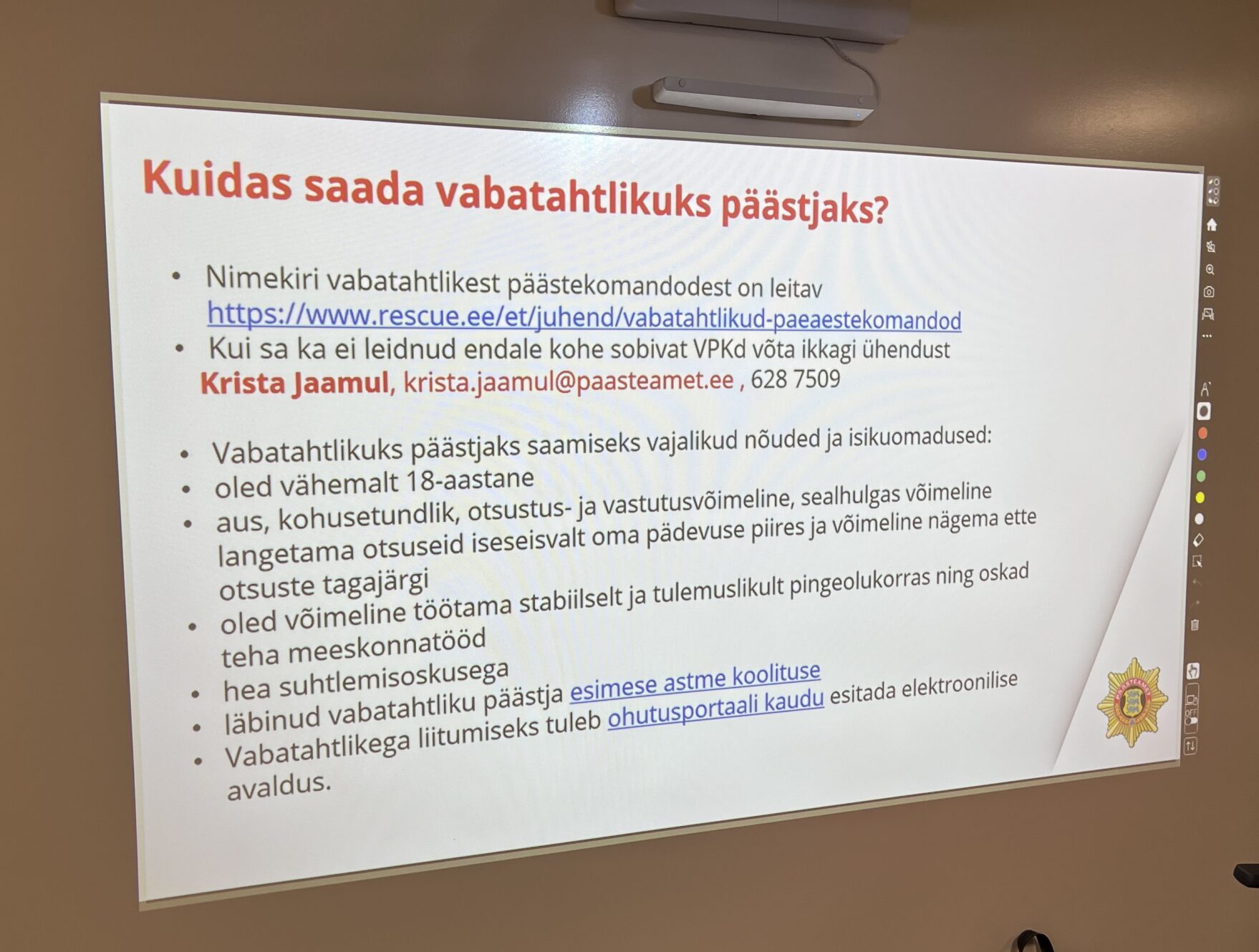 Klassiruumis tutvustati meile vabatahtliku päästja rolli, väljaõppe võimalusi ning seda, kuidas iga kogukonna liige saab panustada Rae valla turvalisusesse. See osa tekitas mitmes meist tõsist huvi ja lisas veelgi austust päästjate töö vastu.
